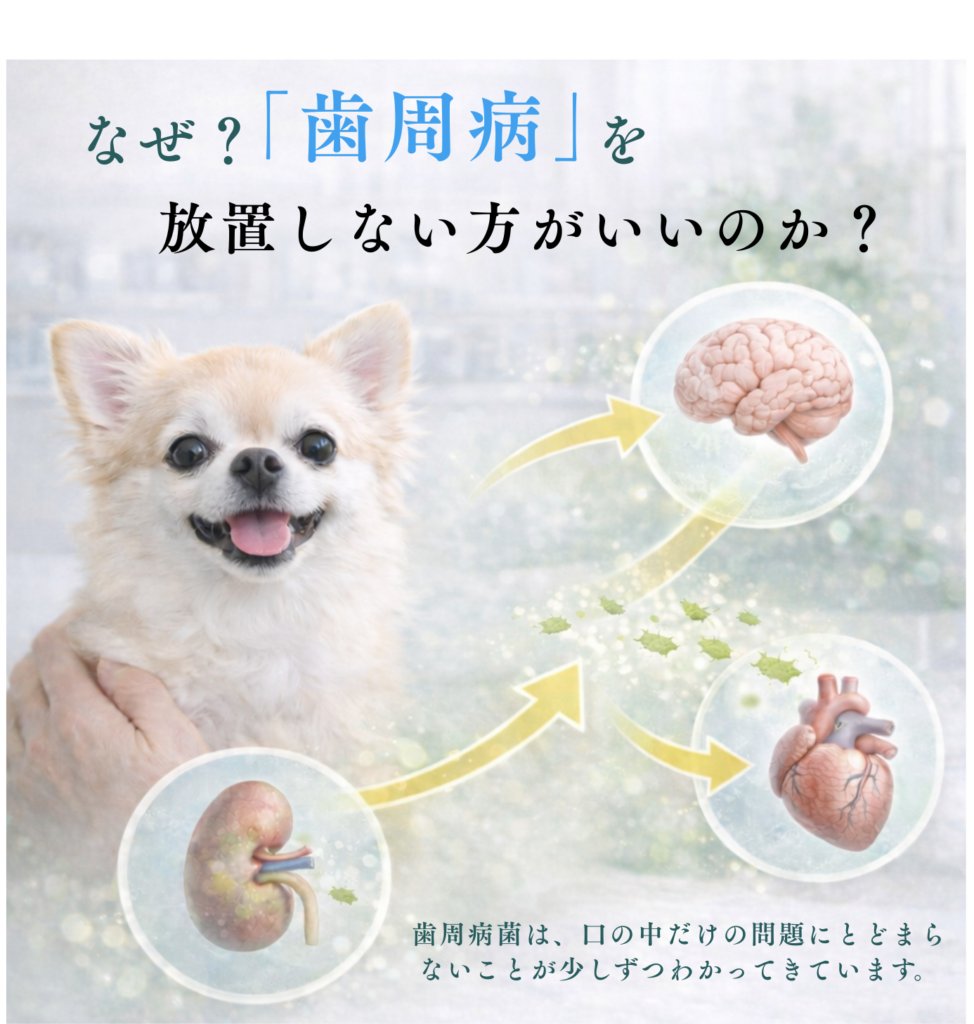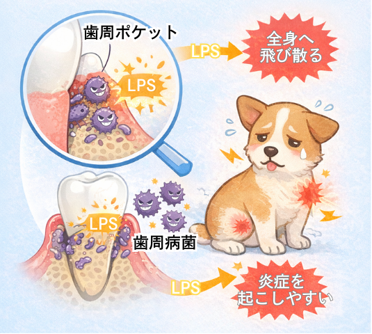 減らせる炎症は減らす、という考え方で口の管理を行うことが、全身の負担を抑えるうえで合理的です。犬/LPS/炎症/歯周ポケット/全身への影響