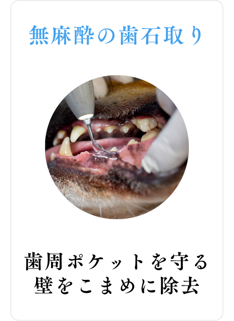 必要な場合は麻酔下歯科へ切り替え、安全を最優先に処置を行なっています。犬/無麻酔/麻酔をしない/歯石取り/安全性