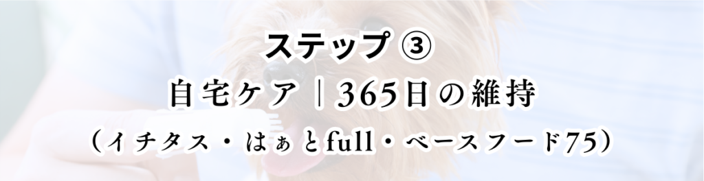 そのためには、ごとふ動物病院内での定期的なケア(ジェットクリーニング)と、ご家庭での継続的なケア(イチタス・はぁとふる・ベースフード75)を組み合わせていくことが、もっとも現実的で安全な方法になります。