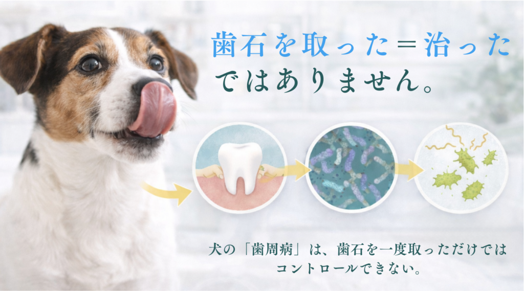 歯周病の本体は歯石ではなく、歯周ポケット内の炎症です。歯石を取っても、歯周ポケットの中では 歯周病菌の膜(バイオフィルム)が24〜48時間ほどでまた作られ始め、口臭・出血・歯肉炎が元通りになりやすくなります。